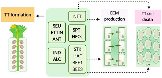 | SEEDSTICK (STK) | MADS-box transcription factor | Ovule identity; normal seed shedding; seed coat development; TT PCD | Septum and ovules | Fail to release seeds; Separation of abscission zone cells fails; fruits are shorter; abnormal positioning of seeds | [36,37] |