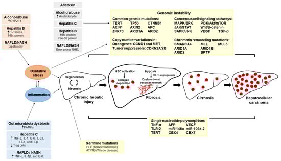 Inherited genomic (germline) mutations and SNPs that predispose to chronic liver diseases are intrinsic risk factors of HCC (Figure 1) []. SNPs are single base-pair substitutions within coding or non-coding regions of DNA that can alter DNA repair, cell regulation, and immunity and significantly increase the risk of cancer pathogenesis []. Human homeostatic iron regulatory protein (HFE) and ATPase copper transporting beta (ATP7B) germline gene mutations can cause chronic liver injury and progression into HCC by excessive iron (hemochromatosis) and copper (Wilson disease) accumulation in the liver, respectively []. Germline mutations together with extrinsic risk factors can significantly increase the risk for HCC. In the case of NAFLD-HCC, germline telomerase reverse transcriptase (TERT) mutations may determine the progression of NAFLD-cirrhosis into HCC []. SNPs in the genes encoding TNF-α [], AFP [], Toll-like receptor (TLR) 2 [], microRNA(miR)-146a and 196a-2 [] and IL-1β [] are known to promote the pathogenesis of HCC. Polymorphisms in the vascular endothelial growth factor (VEGF) gene can promote the recurrence of HCC even after liver transplants []. Clearly there is an important genetic component that predisposes individuals to the development of HCC [].