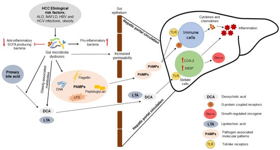 Since the liver is directly connected with the gut through portal circulation, the gut-liver axis can contribute to the pathogenesis of HCC by exposing the liver to PAMPs, such as bacterial lipopolysaccharides (LPS), DNA, peptidoglycans and flagellin (Figure 2). Many of the risk factors of HCC, including HBV and HCV infections, ALD and NAFLD, stimulate GM dysbiosis and increase intestinal permeability (Figure 2) [,]. The nature of HCC-associated GM dysbiosis is determined by HCC etiology. There is a considerable difference between the GM dysbiosis in patients with HBV-related HCC compared to non-HBV/non-HCV-related HCC (NBNC-HCC). The GM species richness of the HBV-HCC patients is significantly high compared to that of NBNC-HCC patients and healthy controls []. In NBNC-HCC, the GM shift favors the promotion of inflammation in the host. Pro-inflammatory bacteria (e.g., Escherichia, Shigella and Enterococcus) are increased in the GM while the anti-inflammatory SCFA-producing bacteria (e.g., Faecalibacterium, Ruminococcus, and Ruminoclostridium) are depleted in the NBNC-HCC patients []. Acetate, propionate and butyrate are the major SCFAs produced by GM. Intestinal epithelial cells, immune cells, and adipocytes express G-protein coupled receptors (GPCR) that are stimulated by SCFAs. Both propionate and butyrate can inhibit the proliferation of lymphocytes, thus opposing inflammation. This is achieved by the stimulation of GPCR41 receptors. SCFAs also inhibit histone deacetylase (HDAC) and cytokine expression by T-cells and activate Treg cells []. The nature of HCC-associated dysbiosis is also influenced by host physiological factors. Analysis of the fecal samples from HCC-cirrhotic patients revealed a significant depletion of GM richness in overweight patients compared to the patients with normal body weight []. Thus, the nature of GM dysbiosis in HCC is significantly dependent on the etiology and host physiological factors.