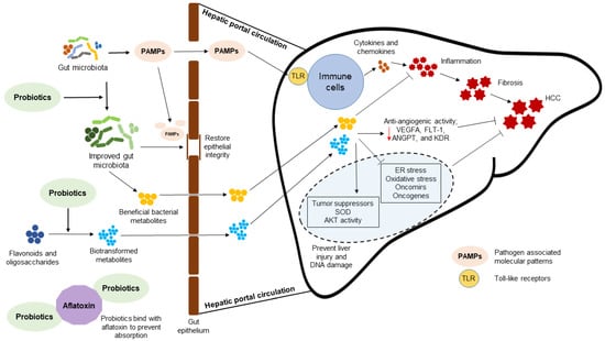 Mechanisms for reduction of hepatocellular carcinoma (HCC) by probiotic bacteria. Probiotic bacteria can enrich the gut microbiota (GM) and prevent the HCC-associated GM dysbiosis. Prevention of GM dysbiosis restores gut epithelial integrity and lowers the levels of pathogen-associated molecular patterns (PAMPs) in the circulation, and prevent hepatic inflammation caused by the stimulation of hepatic immune cells through PAMPs-induced Toll-like receptor (TLR) signaling. Probiotic bacteria can biotransform non-nutritional dietary components (e.g., flavonoids and oligosaccharides) into beneficial metabolites potent in HCC prevention. These metabolites prevent hepatic injury and DNA damage by promoting the expression of tumor suppressor genes protein kinase B (AKT) and superoxide dismutase (SOD), while preventing endoplasmic reticulum (ER) stress, hepatic oxidative stress and activation of oncogenes. Furthermore, these metabolites possess anti-inflammatory and anti-angiogenic properties. Probiotic bacteria can prevent aflatoxin-mediated HCC pathogenesis by binding with aflatoxin and preventing its absorption into body. Down-pointed red arrow represents downregulated gene expression and flathead arrows represent inhibitory effects. ANGPT, Angiopoietin; FLT-1, Fms related receptor tyrosine kinase 1; KDR, kinase insert domain receptor; VEGFA, vascular endothelial growth factor alpha.