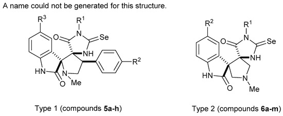 - Novotortsev, V.K.; Kukushkin, M.E.; Tafeenko, V.A.; Zyk, N.V.; Beloglazkina, E.K. New spiro-linked indolinone pyrrolidine selenoxoimidazolones. Mendeleev Commun. 2020, 30, 320–321. [Google Scholar] [CrossRef]