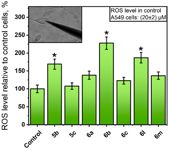 We investigated the ROS production ability of the compounds 5b and 5c and 6a-c, 6l, and 6m, which were tested for the activation of p53. To detect the ROS production in A549 tumor cells, we used an amperometric nanosensor system previously described in [50,51,52] that allowed us to measure the ROS level in single cells using 60–100-nm diameter Pt nanoelectrodes for the amperometric detection of hydrogen peroxide. This method is low-invasive and more accurate in comparison with other methods of ROS determination [51]. The setup allows manipulating the nanoelectrode and precisely penetrating it into a single cell with real-time recording of the differences of the current values between the solution and cell (Figure 3).
