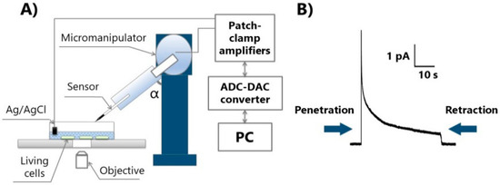 The setup for amperometric measurements (Figure 4) included a PC that was connected to a system consisting of an ADC-DAC converter Axon Digidata 1550B (Axon Instruments, Burlingame, CA, USA) and patch-clamp amplifier MultiClamp 700B (Axon Instruments, USA). The working head of the amplifier was fixed on a PatchStar Micromanipulator (Scientifica, London, UK), which placed near an inverted optical microscope Nikon Eclipse TI-U (Nikon, Tokyo, Japan). A Pt nanoelectrode was fixed by a special holder on the working head of the amplifier. Thus, it was possible to change the position of the electrode with a micromanipulator and carry out an additional assessment in the optical microscope. A reference electrode (Ag/AgCl) was immersed in the buffer solutions (3-M KCl). The potential difference between the Pt nanoelectrode and the reference electrode was recorded with the pClamp 11 software suite (Molecular Devices, Silicon Valley, CA, USA) and processed with Origin 2018 software [57].