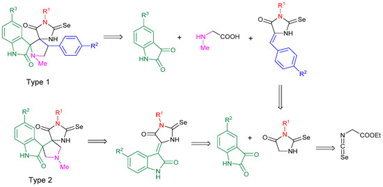 The retrosynthetic scheme for the type 1 and type 2 dispiroselenohydantoins.