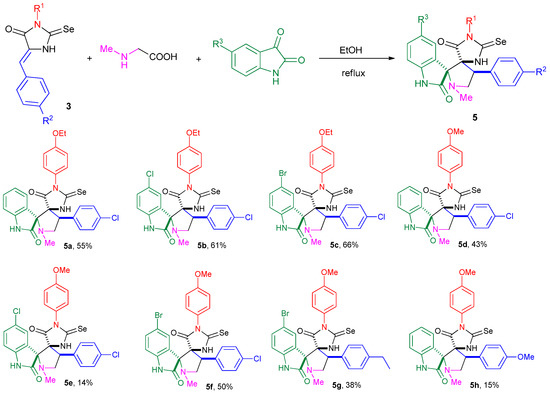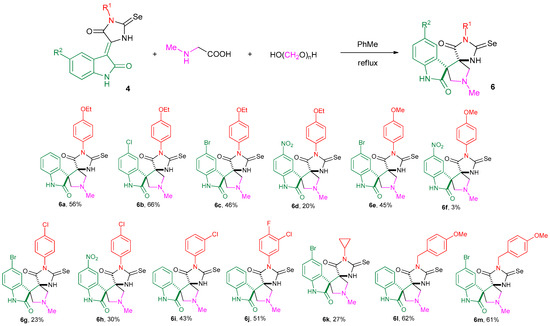 For the synthesis of the target dispiro-selenohydantoine-indolinones 5a-h and 6a-m, the interaction of azomethine ylides, generated from isatins and sarcosine (Scheme 4) or from formaldehyde and sarcosine (Scheme 5), with dipolarophiles 3a-d and 4a-m were used. These reactions provided the desired compounds 5a-h and 6a-m in a moderate-to-high yield.