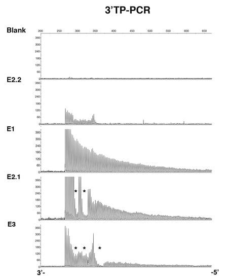 3′ triplet-primed polymerase chain reaction (TP-PCR) results in individuals from family E. The y-axis represents the intensity of fluorescence (arbitrary unit) and the x-axis represents the fragment length in base pair. An asterisk (*) indicates the localization of the interruptions.