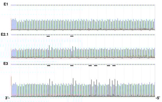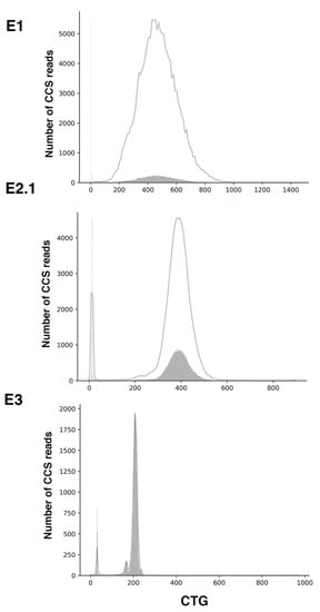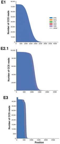 Genetic counseling for DM1 is very complex due to the highly variable clinical presentation and technical difficulties in determining the size and variant repeat interruptions of the large CTG repeat expansions. For several years, the size of the repeat expansions, the degree of somatic mosaicism and DMPK-interrupted alleles have been established as genetic modifiers of DM1 symptoms []. A decrease in somatic mosaicism and CTG repeat length is usually associated with a decrease in the severity and age of onset of DM1 symptoms [,]. The interruptions are associated with a stabilization of the repeat and a modification in the progression of the DM1 symptoms [,,,,,,,]. It is, therefore, crucial to develop a simple and rapid analysis of large CTG repeat expanded sequences to significantly improve our knowledge of DM1. Recently, another study analyzed CTG repeat expansions in different DM1 patients using the penultimate PacBio RSII System. They showed that CCG interruptions are exclusively localized at the end of the sequence in DM1 patients with less than 400 repeats []. However, no data were obtained in DM1 patients with larger repeats. Here, we have analyzed, for the first time, two DM1 families carrying CTG repeats ranging from 170 to over 1000 CTG repeats using the Sequel II System. The Sequel II System generates longer reads, enabling higher CCS accuracy, and has higher throughputs than the Sequel and RSII Systems (data not shown and [,,]). Here, the Sequel II System and bioinformatic tools give us the ability to simultaneously measure repeat numbers with high resolution, to resolve the complete sequence complex repeat expansions and to measure the degree of somatic mosaicism. We have shown that the Sequel II System allows for sequencing a large repeat expansion as large as 2000 CTG repeats in DM1 patients of the family L with more accuracy than conventional PCR (data not shown). In the family E, we identified a major allele with two de novo CCG interruptions occurring across the E1 and E2.1 paternal transmission by the Sequel II System. Interestingly, the number of interruptions increased from one generation to the next in family E, as previously described in several analyses (Table 3). Using the Sequel II System, we have reported that CCG interruptions at the 3′ end of CTG repeat expansions are associated with CTG stabilization/contraction across generations. Here, the Sequel II System makes it possible to estimate the frequency distribution of the CTG repeat. The level of somatic mosaicism is the highest in L2 and L3 with the largest repeat. In family E, the degree of somatic mosaicism is higher in E1 than in E3, suggesting an age- and size-dependent effect on the somatic mosaicism of the DM1 locus. Strikingly, our new data are consistent with previous studies showing that the dynamics of CTG repeat instability are altered by repeat interruptions and the size and age of DM1 patients using conventional PCR or small pool PCR [,,,,,,]. The E3 fetus exhibits two major CTG repeat lengths with approximately 170 and 215 CTG repeats, suggesting that the CTG repeat instability is already detectable at the early stage of embryogenesis as previously reported in the literature [,].