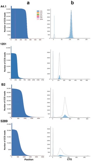 Long-read sequencing results in four DM1 patients (a)—Waterfall plots outline the repeat structure of the normal and expanded alleles. The y-axis shows the number of CSS reads whereas the x-axis shows the length of the CTG repeat expansion in base pairs. The CTG repeat is represented in blue whereas the CAG interruption is represented in purple and the CCG interruptions are represented in orange. The highest peaks represent the normal allele. (b)—CTG repeat size distribution. The y-axis shows the number of CSS reads in the solid blue distribution, whereas the x-axis shows the number of CTG repeats. The grey line represents a kernel density estimation of the underlying blue distribution of CCS reads. A4.1 (CAG interrupted expansion), B2 (CCG interrupted expansion), 1201 and 5289 carry pure CTG repeat expansions.