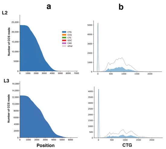 Long-read sequencing results in individuals L2 and L3 carrying more than 1000 CTG repeats. (a)—Waterfall plots outline the repeat structure of the normal and expanded alleles. The y-axis shows the number of CSS reads, whereas the x-axis shows the length of the CTG repeat expansion in base pairs. The CTG repeat is represented in blue. The highest peaks at the far left of the distribution represent the normal allele. (b)—CTG repeat size distribution in DM1 patients with more than 1000 CTG repeats estimated at diagnosis. The y-axis shows the number of CSS reads in the solid blue distribution, whereas the x-axis shows the length of the CTG repeat expansion. The grey line represents a kernel density estimation of the underlying blue distribution of CCS reads.