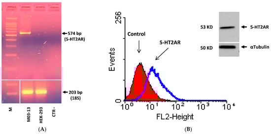 It has been shown that rat primary OPCs express 5-HT1A and 5-HT2A subtypes of serotonin receptors []. Moreover, of particular interest in demyelinating diseases seems to be the 5-HT2AR which act as the glial cell receptor for the human polyomavirus JCV, the causal agent of progressive multifocal leukoencephalopathy, a fatal demyelinating disease developed in immunocompromised subjects []. For these reasons we first ascertain whether M03-13 cells, like primary rat OPCs, express 5-HT1A and 5-HT2A receptors subtypes by means of RT-PCR analysis. We found that M03-13 cells constitutively express 5-HT2A (Figure 1A) but not 5-HT1A receptor mRNA (not shown). Then, the expression of 5-HT2A receptor protein was evidenced by the immunofluorescence flow cytometry technique and by Western blot analysis (Figure 1B).