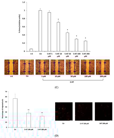 FluoroBlok™ cell culture inserts (Invitrogen Carlsbad, CA, USA) are fitted with polyethylene terephthalate (PET) membrane, which blocks the transmission of visible light between 490 and 700 nm. The cells are placed in the upper chamber, while the lower chamber contains the complete medium acting as an attractant. If able to migrate, the cells will cross the microporous membrane. The migrated cells, treated with a fluorescent probe, can be visualized on the opposite side of the membrane with a fluorescence microscope. FluoroblokTM inserts were placed on the 24-well multi-well plate and rehydrated with smooth DMEM for 2 h in a 37 °C incubator at 5% CO2. At total of 2.5 × 104 cells per spot were suspended in serum-free DMEM in the presence and absence of 100 and 200 µM serotonin (5-HT) and placed in the upper chamber of the insert. The lower face of the membrane was immersed in DMEM enriched with 10% FBS. After incubation for 18–20 h, the culture medium was gently aspirated from the insert, and the cells were fixed with 3.7% paraformaldehyde for 20 min at room temperature and incubated for another 20 min at room temperature with the fluorescent nuclear probe DRAQ5TM (BioLegend, San Diego, CA, USA).