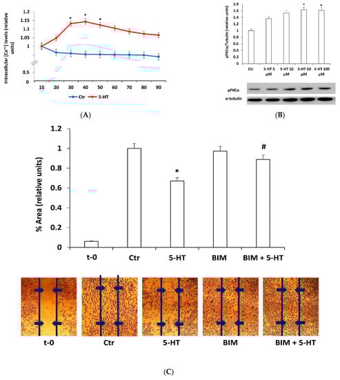 Protein kinase C (PKC) mediates 5-HT effects on M03-13 cell migration. (A) Time course of intracellular calcium levels in M03-13 cells stimulated with 5-HT 50 µM. The graph shows the mean values ± SE (n = 6) relative to control. (B) Western blotting analysis of P-PKCα levels in M03-13 cells incubated for 18 h in medium containing 0.2% Fetal Bovine Serum (FBS) and then stimulated with 5-HT for 30 min. The histogram shows the values (mean ± SE) obtained from the densitometric analysis of the protein bands normalized for α-tubulin in three independent experiments. A representative experiment is shown below the histogram. (C) Scratch analysis of M03-13 cells performed as indicated in Figure 1C. Immediately after the cut the cells were preincubated in the presence or absence of the PKC inhibitor, bis-indolyl-maleimide (BIM) (100 μM) for 30 min and then stimulated with 5-HT (50 μM) and allowed to migrate for 24 h. t-0 represents the sample that was cut immediately prior to analysis. The histogram shows the percentage values of the scratch area covered after 24 h after the application of the cut. On the lower part a representative experiment is shown. * p < 0.005 vs. Ctr, # p < 0.005 vs. 5-HT. The statistical analysis was performed with an ANOVA test (panels (A,B) and a t-test (panel C).