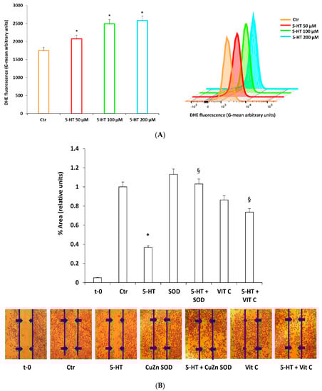 Reactive oxygen species (ROS) mediate 5-HT effects on M03-13 cell migration. (A) Cytofluorimetric determination of ROS levels. M03-13 were treated with 5-HT for 30 min, washed in phosphate-buffered saline (PBS) and resuspended in a serum-free medium containing 10 µM of dihydroethidium (DHE); 50,000 cells were analyzed by cytofluorimetry. (B) Scratch analysis of M03-13 cells was performed as indicated in Figure 1C. Immediately after the cut the cells were preincubated in the presence or absence of CuZnSOD (400 ng/mL) or vitamin C (1 μM) for 30 min and then stimulated with 5-HT (50 μM) and allowed to migrate for 24 h. t-0 represents the sample to which the cut was made just before the analysis. The histogram shows the percentage values of the scratch area covered after 24 h after application of the cut. A representative experiment is shown on the right. * p < 0.001 vs. Ctr, § p < 0.005 vs. 5-HT. The statistical analysis was performed with an ANOVA test (panel (A)) and a t-test (panel (B)).