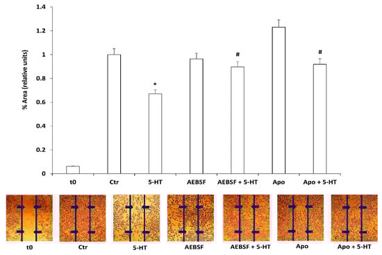 Scratch analysis of M03-13 cells performed as indicated in Figure 1C. immediately after the cut the cells were preincubated in the presence or absence of NOX inhibitors, AEBSF (40 µM) or apocynin (50 μM), for 30 min and then stimulated with 5-HT (50 μM) and allowed to migrate for 24 h. t-0 represents the sample that was cut immediately prior to analysis. The histogram shows the percentage values of the scratch area covered after 24 h after application of the cut. In the lower part a representative experiment is shown. * p < 0.001 vs. Ctr, # p < 0.005 vs. 5-HT. The statistical analysis was performed with a t-test.