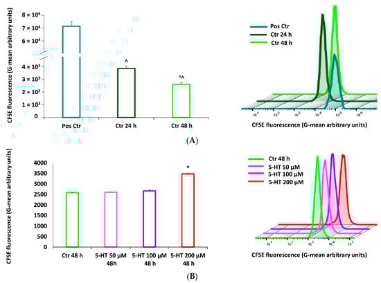 The oligodendrocytes (M03-13 cells) grown to semiconfluence in 100-mm Petri dishes at confluence were trypsinized and 1 × 106 cells were resuspended in complete medium containing CFSE 5 µM; then, cells were incubated for 20 min in an incubator at 37 °C in the dark. Next, the cells were washed in PBS buffer to remove the excess of CFSE and resuspended in complete medium (DMEM) in the presence or in absence of 10, 50, 100 and 200 µM serotonin (5-HT). After 24 h or 48 h the M0313 cells were trypsinized, centrifuged for 5 min at 1000× g, washed and resuspended in PBS Buffer, then the samples were analyzed by flow cytometry using FACSCAN (BD, Heidelberg, Germany) and the data analyzed by FlowJo software.