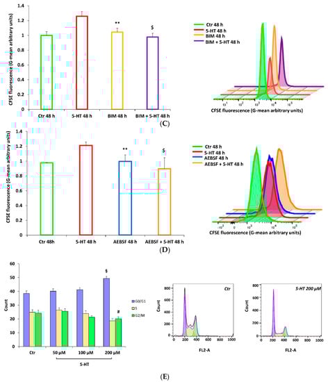 5-HT induces a proliferative block in M03-13 cells. (A) M03-13 were incubated with the succinimide carboxyfluorescein ester (CFSE) for 20 min, washed in PBS and platelets in complete medium. A total of 50,000 cells per point were analyzed by cytofluorimetry. The cells were analyzed 24 and 48 h after incubation with CFSE. The positive control indicates samples incubated with CFSE immediately before harvesting the cells for the analysis. (B) The cells were treated with and without 5-HT 50, 100 and 200 μM for 48 h in the presence of CFSE. (C,D) The cells were preincubated for 30 min with, BIM (10 µM) or AEBSF (10 µM) and then incubated with 200 uM of 5-HT for 48 h in the presence of CFSE. (E) Cell cycle analysis. M03-13 cells were treated with 5-HT for 24 h; the next day they were washed with PBS and treated with propidium iodide (PI) for 30 min; 10,000 cells were analyzed with the cytofluorimeter. The histograms show the averages of three experiments. The figure shows the means ± SE of three independent experiments; on the right the graphs of representative experiments are shown. ^ p < 0.01 vs. Pos Ctr, ° p < 0.01 vs. Ctr 24 h, * p < 0.05 vs. Ctr 48 h, ** p < 0.005 vs. Ctr 48 h, $ p < 0.05 vs. 5-HT 48 h, § p < 0.005 vs. Ctr G0/G1, # p < 0.005 vs. Ctr G2/M. The statistical analysis was performed with an ANOVA test (panels A, B and D) and with a t-test (panel C).