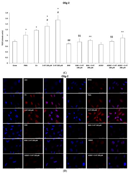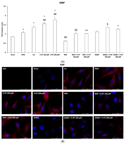 5-HT mimics oligodendrocyte differentiation stimulus inducing immunofluorescence microscopy levels of myelin basic protein (MBP) (A,B) and Olig-2 (C,D) in M03-13 cells. The cells were grown in medium without serum in the absence (Ctr) or presence of 100 nM phorbol 12-myristate 13-acetate (PMA)) or 100 and 200 μM 5-HT for 24 h. The inhibitors BIM (100 μM) and AEBSF (100 μM), were added in medium without serum 30 min prior to 5-HT stimulation. Cells were stained with nuclear dye 4,6-diamidino-2-phenylindole (DAPI) and with primary anti human MBP antibodies or anti human Olig-2 antibodies and CY3-conjugated anti rabbit IgG as secondary antibodies. Ab II was treated with secondary antibodies and DAPI alone. Grow indicates cells cultured in complete medium. In the immunoreactivity images of Olig-2 (D) three panels are shown: on the left nuclei (blue); on the center Olig-2 (red); on the right the merged image. The histograms (A, C) show the mean ± SE total corrected cellular fluorescence (TCCF) values obtained by quantitative analysis of 50 cells for each sample from three independent experiments performed in triplicate. * p ≤ 0.01 vs. grow; # p < 0.05. ## p ≤ 0.01 vs. Ctr; § p < 0.05, §§ p < 0.01 vs. 5-HT 100 µM; ^ p < 0.05, ^^ p < 0.01 vs. 5-HT 200 µM. The statistical analysis was performed with an ANOVA test. The images for quantitative analysis were acquired with a 20× objective. Panels B and D show representative images acquired with a 63× objective.