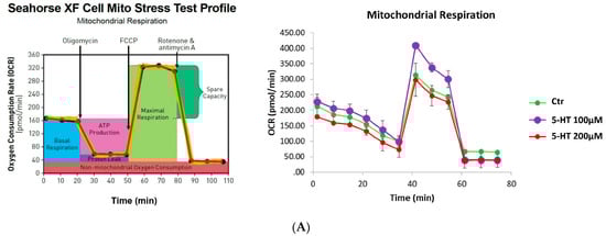 Cellular oxygen consumption measurements in M03-13 cells were performed by the Seahorse XFp analyzer (Seahorse Biosciences, North Billerica, MA, USA), by using the Cell Mito Stress Test kit (cat# 103010-100). Control cells and 5-HT treated cells (100 and 200 µM) were seeded (30.000 cells/well) in Seahorse mini plates in complete medium for 12 and then it was removed, and the cells were replaced with medium containing 0.2% FBS. Before cell mito stress analyses, the medium was replaced with a buffered base medium (Agilent Seahorse-103193) supplemented with 2 mM glutamine, 1 mM pyruvate and 10 mM glucose at pH 7.4 and equilibrated at 37 °C in a CO2 free incubator for at least 1 h. Basal oxygen consumption rate (OCR) was determined in the presence of glutamine (2 mM) and pyruvate (1 mM). The proton leak was determined after inhibition of mitochondrial ATP production by 1 µM oligomycin, as an inhibitor of the F0-F1 ATPase. Furthermore, the measurement of the ATP production in the basal state was obtained from the decrease in respiration by inhibition of the ATP synthase with oligomycin. Afterward, the mitochondrial electron transport chain was stimulated maximally by the addition of the uncoupler FCCP (1 µM). Finally, the extra-mitochondrial respiration was estimated after the addition of the inhibitors of the complexes I and III, rotenone A (0.5 µM) and antimycin (0.5 µM). Coupling efficiency is the proportion of the oxygen consumed to drive ATP synthesis compared with that driving proton leakage and was calculated as the fraction of basal mitochondrial OCR used for ATP synthesis (ATP-linked OCR/basal OCR). Spare capacity is the capacity of the cell to respond to an energetic demand and was calculated as the difference between the maximal respiration and basal respiration. The mitochondrial respiration was expressed as the oxygen consumption rate per minute normalized to the number of cells. The data normalization of OCR can be performed in different ways to minimize inconsistency and variations from well-to-well []. In our experimental conditions, the same cell number/well was plated before the OCR measurements; the cell count was obtained by using the Burker chamber. Cell counting is a non-destructive method to generate data for Seahorse normalization. In addition, at the end of analyses, we determined the protein content/well by Bradford assay without observing significant differences.