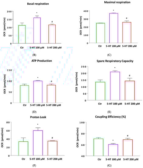 Effects of 5-HT on oxygen consumption rate (OCR) performed by Seahorse XFp analyzer in M03-13 cells. (A) Representative seahorse time courses of OCR; where indicated in the left panel, the following compounds were added: oligomycin, carbonyl cyanide 4-(trifluoromethoxy)phenylhydrazone (FCCP), rotenone plus antimycin A. Each point in the OCR time courses is the average SE of four technical replicates. Basal respiration (B), maximal respiration (C), ATP production (D), spare respiratory capacity (E), proton leak (F) and coupling efficiency (G) are reported. Data are presented as means ± ES. * p < 0.05 vs. Ctr, # p < 0.05 vs. 5-HT 100 μM. The statistical analysis was performed with an ANOVA test.