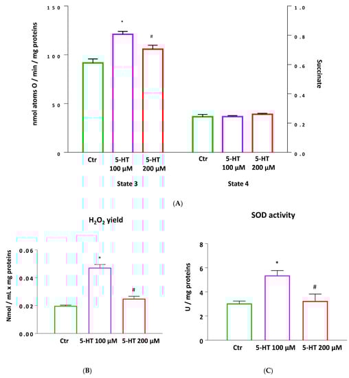Effect of 5-HT 100 μM and 200 μM on isolated mitochondria from M03-13 cells monitored by Hansatech respirometer. Mitochondrial respiration rates measured in the presence of succinate, rotenone and Adenosine diphosphate (ADP) (state 3) and in the absence of ADP (state 4) (A), H2O2 yield (B) and SOD activity (C) are reported. Data are presented as means ± ES. * p < 0.05 vs. CTR, # p < 0.05 vs. 5-HT 100 μM.