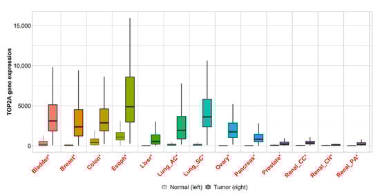 Boxplots of top two genes differentially expressed in most of the ten common tumor types. Significant differences by a Mann–Whitney U test are marked with red color (* p < 0.01).