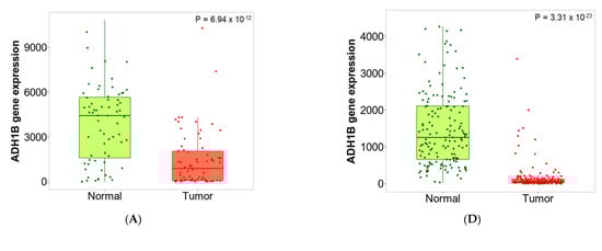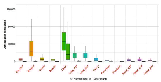 The most consistently downregulated gene across the investigated tumor types was Alcohol dehydrogenase 1B (ADH1B), a member of the alcohol dehydrogenase enzyme subgroup which serves as an important member in the ethanol, retinol and further alcoholic substance metabolization processes. In concordance with our results, earlier studies came to a comparable conclusion, as downregulation of ADH1B might have a role in multiple cancers, including colon [], lung [] or head and neck cancer [].