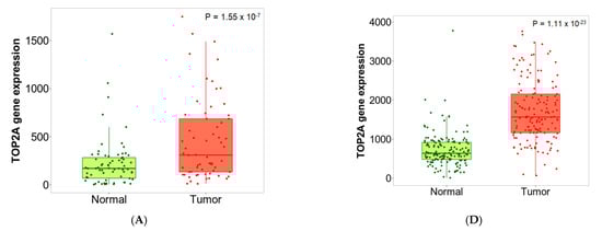 After completing the entire database, our paramount question was: which genes are most specific to cancer across multiple tumor types? We performed a comparative study across the top ten most deadly tumor types and ranked the common genes in these malignancies, regardless of the platform. The most consistently upregulated gene was DNA topoisomerase 2-alpha (TOP2A), a gene playing an important role in transcription and replication. Several studies highlighted the importance of TOP2A, and elevated TOP2A expression can serve as a prognostic biomarker in multiple malignancies, including lung [], colon [], and breast cancer []. At present, multiple drugs, including doxorubicin, epirubicin or etoposide, are widely used in clinical practice to target TOP2A or other topoisomerase gene products []. These agents are now used in multiple tumor types, including breast cancer [], leukemias and lymphomas [,].
