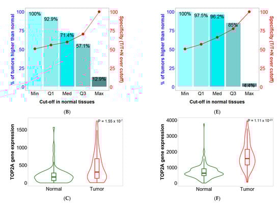 Boxplots (A,D), bar charts (B,E) and violin plots (C,F) of TOP2A gene expression in breast (left) and colon cancer (right) when comparing paired normal and tumor gene array data. The bars represent the proportions of tumor samples that show higher expression of the selected gene compared to normal samples at each of the quantile cutoff values (minimum, 1st quartile, median, 3rd quartile, maximum). Specificity is calculated by dividing the number of tumor samples with the sum of tumor and normal samples below each given cutoff. In cases where the fold change was over 1, those “over” were used instead of those “below”.