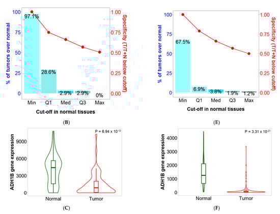 Boxplots (A,D), bar charts (B,E) and violin plots (C,F) of ADH1B gene expression in breast (left) and colon cancer (right) when comparing paired normal and tumor gene array data. The bars represent the proportions of tumor samples that show higher expression of the selected gene compared to normal samples at each of the quantile cutoff values (minimum, 1st quartile, median, 3rd quartile, maximum). Specificity is calculated by dividing the number of tumor samples with the sum of tumor and normal samples below each given cutoff. In cases where the fold change was over 1, those “over” were used instead of those “below”.