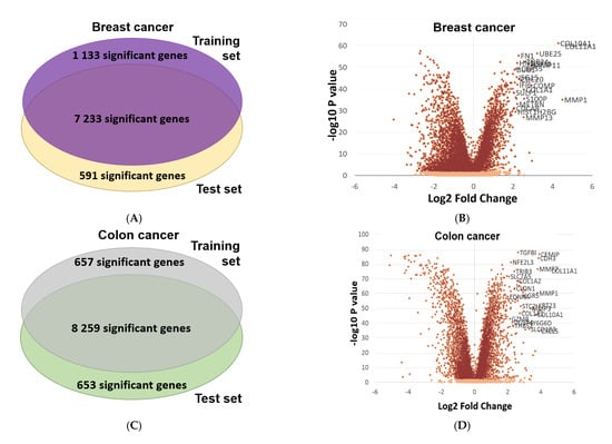In order to confirm the reproducibility of differential expression, and to confirm the reliability of the integrated database, we conducted a validation using randomly selected training and test cohorts across breast, lung and colon cancers using both RNA-seq and gene array samples. During this process, we analyzed the normal–tumor gene-expression difference for all genes in these three selected tissue types. Randomly selected sample cohorts comprised the test and the training set, and we conducted differential gene-expression analysis for all genes in both training and test sets using a Mann–Whitney U test. In each setting, the training and test sets were equally sized to avoid false positive or false negative findings. Using a chi-square test, we aimed to validate the proportion of differentially expressed genes across both test and training sets. In the breast cancer gene array and RNA-seq datasets, respectively, 7223 and 11,689 genes showed significant difference in both training and test sets. These deliver a high concordance in both cases with a chi-square test p value <0.0001. Regarding colon cancer, 8259 and 6763 genes presented significant difference in both training and test datasets in gene array and in RNA-seq samples, respectively (p < 0.0001). In lung cancer, altogether, 7846 and 8484 overlapping genes reached significance in both examined cohorts in the gene array platform and in RNA-seq, respectively (p < 0.0001). As each executed analysis showed a p < 0.0001, we concluded that the database could provide highly reproducible results in both platforms. Volcano plots and Venn diagrams depicting the results of the validation are listed in Figure 4.