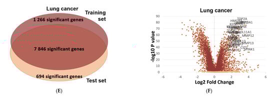 Volcano plots and Venn diagrams of differentially expressed genes in breast, colon and lung cancer using equally sized training–test sets —Venn diagram (A) and Volcano plot (B) from breast cancer; Venn diagram (C) and Volcano plot (D) from colon cancer Venn diagram (E) and Volcano plot (F) from lung cancer.