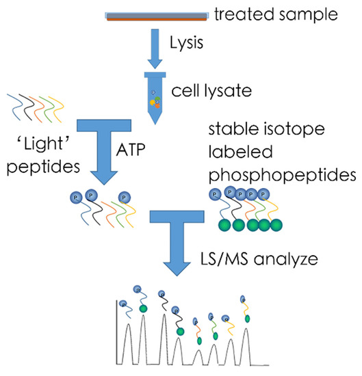 - Yu, Y.; Anjum, R.; Kubota, K.; Rush, J.; Villen, J.; Gygi, S.P. A site-specific, multiplexed kinase activity assay using stable-isotope dilution and high-resolution mass spectrometry. Proc. Natl. Acad. Sci. USA 2009, 106, 11606–11611. [Google Scholar] [CrossRef]