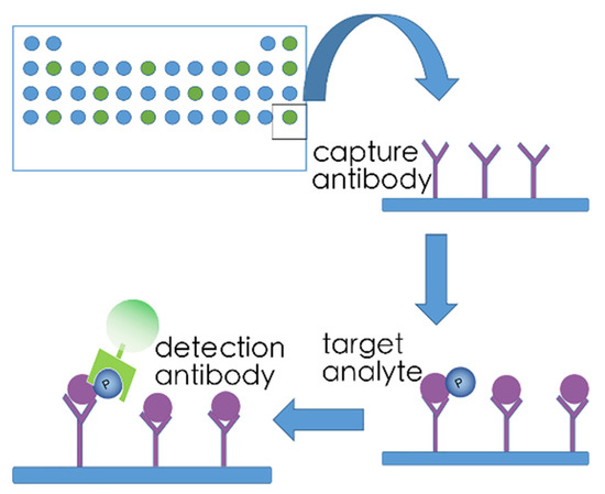 Instead of measuring phosphorylation of target sequences by radioactively labeled ATP, phospho-tyrosine or phosphor-serine/threonine specific antibodies can also be used [101,102]. A commercial example of this is PamChip (Pamgene), a chip containing four identical peptide arrays, each array containing 144 (STK) or 196 (PTK) peptide sequences of 13 amino acids long (Figure 5). Again, these peptides have been selected from the literature or computational prediction to be associated to one or several upstream kinases. During the kinase reaction, each peptide that has been phosphorylated will be marked by fluorescently labeled antibodies and images are taken every 5 min to generate real-time kinetics data [103,104]. Then, over time, complex outcomes can be generated. While other methods capture kinase activity or its outcome at one individual time point, this technique incorporates kinetic information, adding a layer of sensitivity. However, while current detection techniques allow simultaneous measurement of hundreds of kinetic reactions in one sample, static read out arrays (e.g., Pepchip) may contain up to one thousand kinase substrates. Nevertheless, because of low requirements with respect to input and very high reproducibility the kinetic technique is well suited for small diagnostic samples, e.g., liver biopsies.