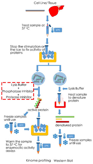 An important note to make is one of a technical nature. Unlike Western blot analysis, kinome profiling approaches generally depend on the lysis of tissue samples and the extraction of their native kinases (see Figure 6). This is in order to allow capture of kinases in their native form by antibodies/chemicals and/or measurement of activity of the enzymes. As such, the obtained results will represent the overall kinase activity in all different cell types available in the sample, which in turn will largely depend on the quality of the tissue. For instance, one should ensure that tissues are immediately snap-frozen or immediately lysed upon collection of specimens to guarantee that differences in degradation of the proteins in different samples do not influence results. Addition of phosphatase and protease inhibitors is recommended in this respect. Additionally, when comparing stimulated vs. unstimulated samples (e.g., for primary cells or cell line experiments), it is essential to terminate reactions on ice to prevent kinases and phosphatases to further affect cellular phosphorylation levels and thus kinase activities. Furthermore, protein quantification prior to analysis is imperative to ensure that differences in kinase activities observed are not the result of loading different protein quantities. Unlike Western blot analysis, the use of a housekeeping protein is not yet commonplace for kinome profiling assays.