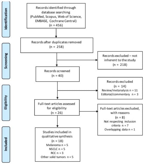A total of 456 citations were retrieved upon systematic literature search, among which 198 were duplicates and 218 were initially excluded through reviewing titles and abstracts. The remaining 46 records were screened, and 14 were excluded as not reporting original data. The remaining 26 studies were subsequently reviewed and screened according to our inclusion and exclusion criteria. Finally, 18 studies were included in our systematic review (Figure 2) [,,,,,,,,,,,,,,,,,]. The included studies were published between 2018 and 2020, and were retrospective studies, either single or multicenter; one study was a pooled analysis of patients treated with immunotherapy in the context of phase 2 and 3 trials. Table 1 displays the main characteristics of the studies included in the analysis. Overall, most studies reported data of patients with melanoma (n = 5), non-small cell lung cancer (NSCLC) (n = 5), and renal cell carcinoma (RCC) (n = 3); indeed, these were the most common diagnoses even among patients included in the remaining 5 studies (see Table 1 for more details). Supplementary Table S1 displays the search strategy used, and results of the search from each database. Table 2 displays the quality score according to the Newcastle Ottawa Scale (NOS), and the risk of biases assessment. Table 3 reports the statistical methods and results for each analyzed study.