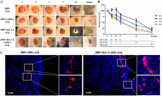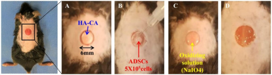 Forty C57BL/6 mice were equally divided into four groups: control diabetic wound (DBW) group, ADSCs group, HA-CA group, and HA-CA + ADSCs group. Diabetes induction was performed by intraperitoneal injection of streptozotocin (STZ; Sigma-Aldrich) at a dose of 150 mg/kg dissolved in citrate buffer (pH 5.5) [37,38]. Blood was drawn from the tail vein, and the glucose level was determined using a glucometer (Accu-Check Performa; Roche, Pleasanton, CA, USA). The blood glucose level and body weights were measured every 3 days. Mice with blood glucose levels >250 mg/dL were considered diabetic. After 4 weeks of STZ administration, mice were anesthetized with 2% isoflurane inhalation. Excisional biopsy wounds on the shaved dorsal regions of the midline extending through the panniculus carnosus were made using a 6 mm punch. ADSCs (5 × 105 cells/100 µL) labeled with PKH26 (Sigma-Aldrich) were transplanted into healthy tissue at the wound boundary, while HA-CA patches were injected at the wound site. The HA-CA patch (6 mm) was placed on the DBW (Figure 7). Wound areas were photographed on days 1, 3, 5, 7, 14, and 21 after ADSC and HA-CA transplantation. We identified the wound margins as whitish, dry, membrane-like structures, and measured the surface area using ImageJ software (version 1.51j8; National Institutes of Health, Bethesda, MD, USA). Changes in wound area over time were expressed as the percentage of the initial wound area.