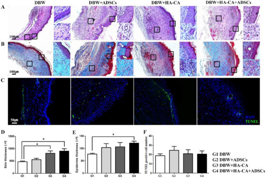 In comparison with the DBW group, the skin was significantly thicker in the HA-CA and HA-CA + ADSCs groups (DBW group, 468 ± 34; ADSCs group, 555 ± 52; HA-CA group, 815 ± 90 *; HA-CA + ADSCs group, 900 ± 102 μm *, * p < 0.05). The epidermis was thickest in the HA-CA + ADSCs group (DBW group, 77 ± 4; ADSCs group, 104 ± 16; HA-CA group, 107 ± 17; HA-CA + ADSCs group, 122 ± 7 μm *, * p < 0.05; Figure 2D,E).