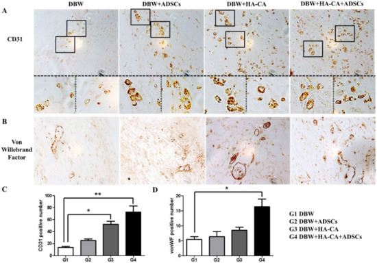 To examine wound neovascularization, we performed immunohistochemical staining for the endothelial cell-specific markers cluster of differentiation 31 (CD31) and von willebrand factor (vWF). Most of the CD31- and vWF-positive vessels were distributed in the lower middle part of the reticular layer of the dermis. CD31 is expressed in small vessels, mature blood vessels, and immature vascular structures. Most CD31-positive vessels were 10–15 μm in diameter and none exceeded 20 μm. Compared with the control DBW group, the number of CD31-positive vessels was higher in mice treated with HA-CA and HA-CA + ADSCs (control DBW group, 14 ± 2; ADSCs group, 25 ± 3; HA-CA group, 52 ± 5 *; HA-CA + ADSCs group, 73 ± 10 **; * p < 0.05, ** p < 0.01; Figure 3A,C). The vWF-positive vessels were larger than CD31-positive vessels and were 20–30 μm in diameter, with some exceeding 40 μm. Mice in the HA-CA + ADSCS group had the greatest number of vWF-positive vessels (control DBW group, 5 ± 1; ADSCs group, 6 ± 2; HA-CA group, 9 ± 1; HA-CA + ADSCs group, 16 ± 3 *; * p < 0.05; Figure 3B,D).
