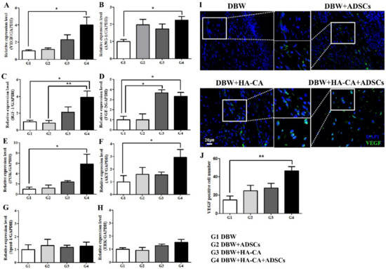 To further confirm the effects of ADSCs and HA-CA on angiogenesis, we performed immunofluorescence staining for VEGF. Compared with the DBW group, in which the number of VEGF-expressing cells was low, the numbers of VEGF-positive cells were significantly higher in the ADSCs and HA-CA groups. In particular, mice treated with HA-CA + ADSCs had the greatest number of VEGF-expressing cells (Figure 4I). VEGF-positive cells were counted manually in microscopic fields and were highest in the HA-CA + ADSCs group (control DBW group, 15 ± 4; ADSCs group, 25 ± 6; HA-CA group, 28 ± 5; HA-CA + ADSCs group, 46 ± 5 **; ** p < 0.01; Figure 4J).