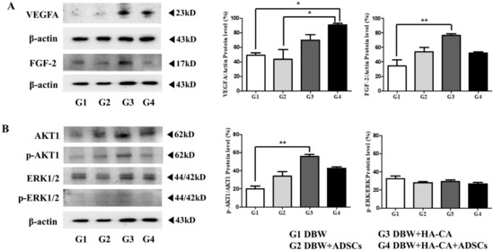 Angiogenesis-related protein expression after treatment with HA-CA and ADSCs. The expression levels of the angiogenesis-associated proteins (A) VEGFA and FGF-2, and (B) AKT1, p-AKT1, ERK1/2, and p-ERK1/2 were determined by Western blotting. Data are presented as means ± SEM relative to β-actin (* p < 0.05, ** p < 0.01; n = 4 per group). VEGFA, vascular endothelial growth factor A; FGF-2, fibroblast growth factor 2; AKT, protein kinase B; p-AKT, phospho-AKT; ERK1/2, extracellular signal-regulated kinase1/2; p-ERk1/2, phospho-ERK1/2.