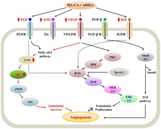 ADSCs secrete various growth factors and cytokines, including VEGF, IGF-1, and FGF, promoting angiogenesis and tissue regeneration [16,30]. In this study, we showed that treatment with HA-CA combined with ADSCs significantly upregulated the expression of VEGF, Ang-1, IGF-1, and FGF-2. Importantly, mice treated with HA-CA + ADSCs exhibited the highest mRNA levels of VEGF and IGF-1. These results confirmed the synergistic neovascularization-promoting effects of HA-CA and ADSCs. Although the PI3K and Akt mRNA levels were significantly increased upon treatment with HA-CA + ADSCs, we found no changes in the expression levels of ERK and Spred1.