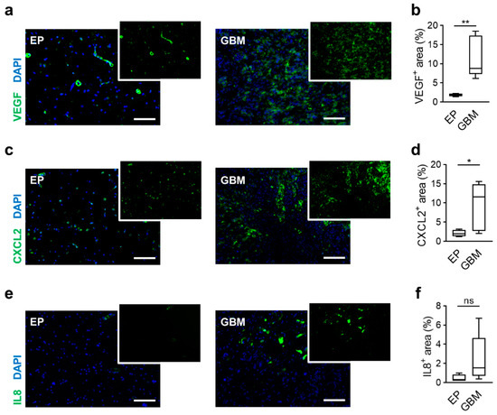 Overexpression of proangiogenic factors in human GBM. (a,c,e) Tissue sections of epilepsy (EP) and glioblastoma (GBM) patients were stained for proangiogenic factors like VEGF (a), CXCL2 (b) and IL8 (c). green: indicated molecule, blue: DAPI (nuclei). Scale bars 100 µm. (b,d,f) Graphs depict calculation of the stained area of VEGF (b), CXCL2 (d) and IL8 (f). * p < 0.05, ** p < 0.01, ns = not significant. Student’s t-test. n = 4 in EP and n = 8 in GBM.
