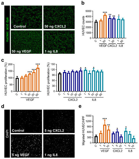 The positive effect of VEGF on endothelial cells is well known, while influence by CXCL2 and IL8 is analyzed to a lesser extent [36,37]. Hence, we evaluated the proliferative and migratory activity of human endothelial cells in reaction to these molecules. Counting cells following stimulation with angiogenic factors revealed that VEGF as well as CXCL2 and IL8 were able to induce proliferation of HUVEC (Figure 4a,b). Colorimetric analysis showed a dose-dependent increase in proliferative activity if rising concentrations of VEGF were added, while CXCL2 and IL8 resulted in enhanced proliferation by using specific molecule concentrations (Figure 4c). Additionally, investigation of the endothelial cell migration revealed that both factors significantly improved the motility of HUVEC in a dose-dependent manner, even though CXCL2 and IL8 did not reach the high level of migratory response as mediated by VEGF (Figure 4d,e). Consequently, CXCL2 and IL8 can induce proliferation and mobilization of primary endothelial cells but with lesser potency than VEGF.