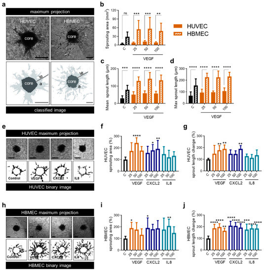 To further characterize the functional effect of proangiogenic molecules on endothelial cell populations, we performed an in vitro angiogenesis assay using spheroids of HUVEC as well as brain endothelial cells. Sprouting assays for HUVEC are established [38], while corresponding assays with primary brain endothelial cells were lacking. However, investigating the effect of VEGF, CXCL2 and IL8 on HBMEC was of special interest because these cells may react differently than the well-established HUVEC. Therefore, we first set up a novel protocol for the 3D angiogenesis assay with HBMEC. We tested different cell numbers, embedding conditions and collagen concentrations. In comparison to HUVEC, we had to use twice as many cells (500 cells/spheroid vs. 1000 cells/spheroid) and a higher concentration of Methocel (0.6% vs. 1.2%) to obtain stable HBMEC spheroids. Other parameters were unchanged, guaranteeing the comparability of experiments. Following establishment, we observed robust sprouting of HBMEC which differed from sprouting of HUVEC spheroids (Figure 5a). HBMEC showed higher basic sprouting parameters than HUVEC, e.g., total sprouting area (Figure 5b) and sprout length (Figure 5c,d). Additionally, after stimulation with VEGF in various concentrations the sprouting area of HBMEC was fivefold higher (Figure 5b) and mean sprout length 2.5-fold longer in comparison to HUVEC (Figure 5c), thus implicating a strong angiogenic activity of HBMEC. Compared to the control, all concentrations of VEGF on HBMEC as well as 25 and 100 ng/mL on HUVEC led to a two-fold increase of the sprouting area whereas 50 ng/mL VEGF led to a threefold increase of the sprouting area on HUVEC (Figure 5b). The alteration in mean sprout length compared to the control was similar between HUVEC and HBMEC (Figure 5c).