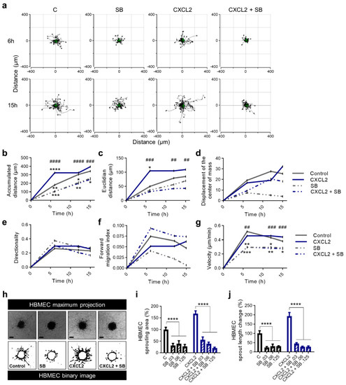 First, we realized a chemotaxis assay using HUVEC in µ-Slide chambers to track the motility of single cells. We were able to demonstrate that SB225002 inhibited the action of endothelial cells with and without simulated overexpression of CXCL2 (Figure 6a). Overall, the strongest changes of all parameters were observed within 6 h (Figure 6b–g). Here, the accumulated distance, Euclidian distance and velocity reached a plateau and the directionality and forward migration index (FMI) decreased. Application of the CXCR2 antagonist led to changes of chemokinetic parameters, including reduction in accumulated distance (Figure 6b), Euclidian distance (Figure 6c) and velocity (Figure 6g). The equally pronounced effect of SB225002 on CXCL2 treated and non-treated cells of the control group suggest a high efficacy of the CXCR2 antagonist. However, there was no significant increase in the displacement of the center of mass (Figure 6d) nor the FMI (Figure 6f) towards CXCL2 or SB225002. Therefore, no chemotactic effect of these molecules in this experimental setup could be observed. Furthermore, p values for the Rayleigh test were not significant after 15 h (data not shown) indicating a homogenous distribution of cells even at the end point of experiments.
