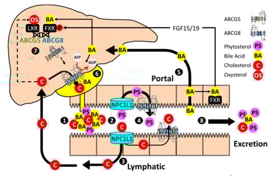 - Wang, H.H.; Patel, S.B.; Carey, M.C.; Wang, D.Q. Quantifying anomalous intestinal sterol uptake, lymphatic transport, and biliary secretion in Abcg8(-/-) mice. Hepatology 2007, 45, 998–1006. [Google Scholar] [CrossRef] [PubMed]
