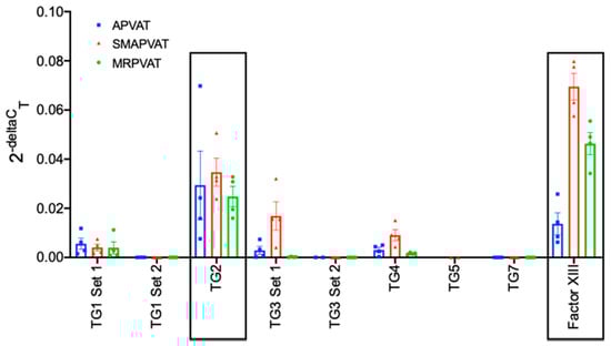 Expression of transglutaminase family genes in APVAT (blue), SMAPVAT (red), and MRPVAT (green). Multiple primers were used for TG1 and TG3, as indicated by set 1 and set 2. Boxes indicate target transglutaminases used for further studies. β-2-microglobulin was used as the reference gene. Data are expressed as mean ± SEM. n = 4 rats for each group.