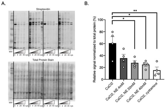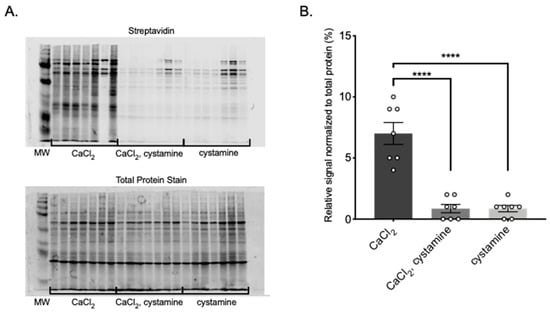 Figure 4A demonstrates incorporation of BAP into many proteins of MRPVAT, observed as stronger signal in lanes where only CaCl2 was present. Importantly, the isoform non-specific inhibitor cystamine significantly reduced the calcium-driven TG reaction, visualized with reduced signal in lanes where both CaCl2 and cystamine were present (Figure 4A). Cystamine alone lanes act as a negative control, proving that cystamine is reducing BAP incorporation in a calcium-dependent manner. While it would be assumed that cystamine alone lanes should appear blank, there is still endogenous calcium within the protein homogenate that likely drives the TG reaction, as well as low concentrations of endogenous biotin that may be tagged by the streptavidin secondary. These data are quantified in Figure 4B, in which all bands in each lane are included in the scatter plot. The ability of cystamine to inhibit the incorporation of the biotin labeled amine suggests that BAP incorporation into proteins of MRPVAT is TG-dependent.