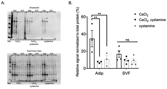 BAP incorporation into MRPVAT adipocytes and SVF visualized with IRDye 800CW Streptavidin secondary (A top) and total protein stain (A bottom). Quantification of the relative signal normalized to the total protein stain (B). Data are expressed as mean ± SEM. n = 3 rats per group for adipocyte samples and n = 4 rats per group for SVF samples. ** p < 0.01 compared to only CaCl2 treated MRPVAT adipocyte protein by one-way ANOVA with Bonferroni’s multiple comparison.