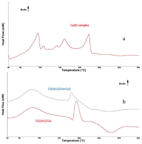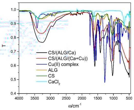 The spectra of CS/(ALG/Ca) and CS/(ALG/(Ca+Cu)) are very similar but they differ in the position and intensity of the main bands. The presence of Cu(II) complex in the alginate matrix causes the most significant changes in the alginate functional groups region, hydroxyl (OH), ether (COC), and carboxylate (COO